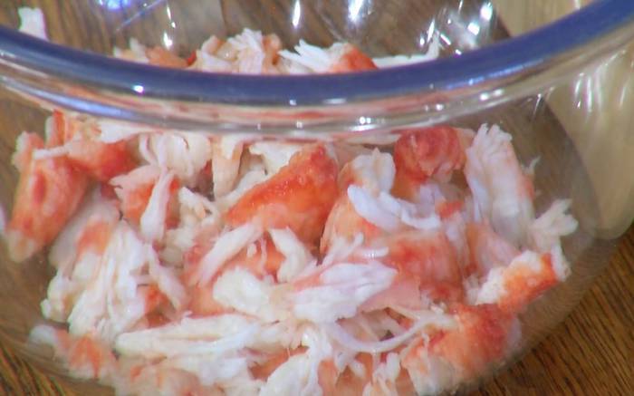 Крабовое мясо разобрать на небольшие кусочки, удалив жесткие перепонки.