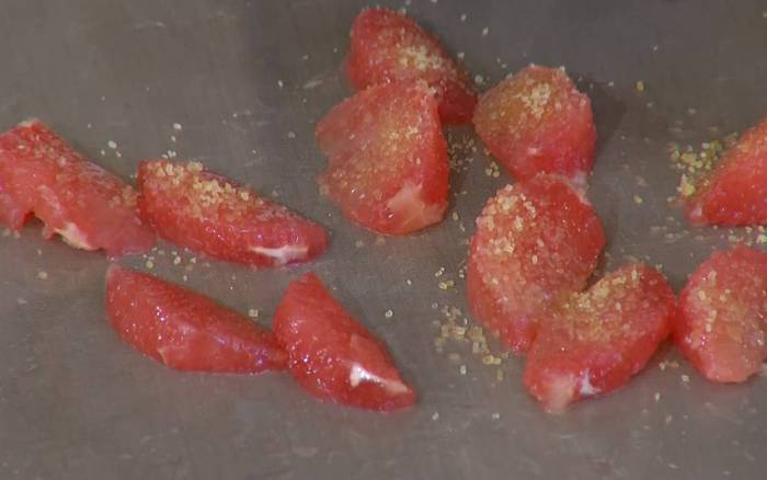 Мякоть грейпфрута выложить на противень, выстеленный бумагой для выпечки, посыпать сахаром и отправить под разогретый гриль на 10 минут.