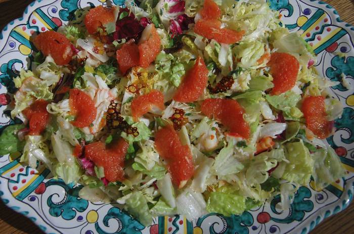 Этот салат прекрасно подойдет для гарнира, чтобы гости после жареного мяса или шашлыка не чувствовали себя тяжело. Если при запекании грейпфрута останется карамелизированный сахар, им тоже можно украсить салат.