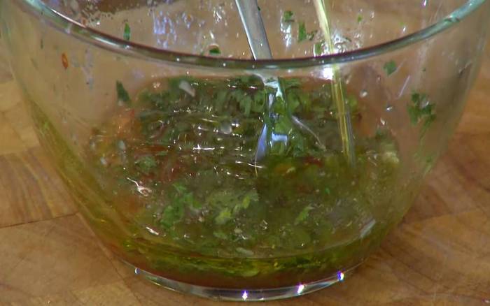Приготовить заправку: цедру и сок лайма соединить с соком грейпфрута, добавить мед, соус чили, мяту, влить оливковое масло и все перемешать.