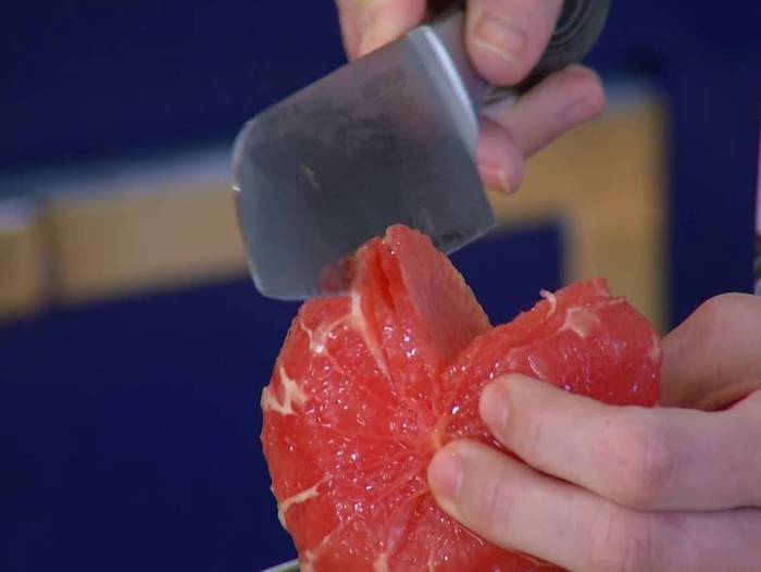 С грейпфрута срезать кожуру и вырезать мякоть, сохранив выделившийся при этом сок.