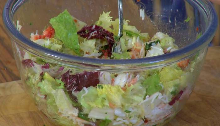 К крабовому мясу добавить листья салата, полить все заправкой, посолить, поперчить и перемешать.