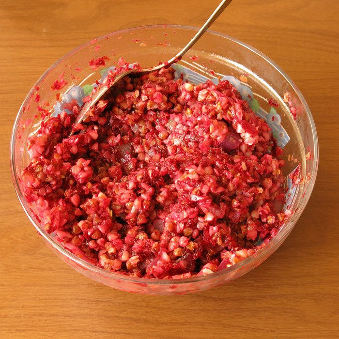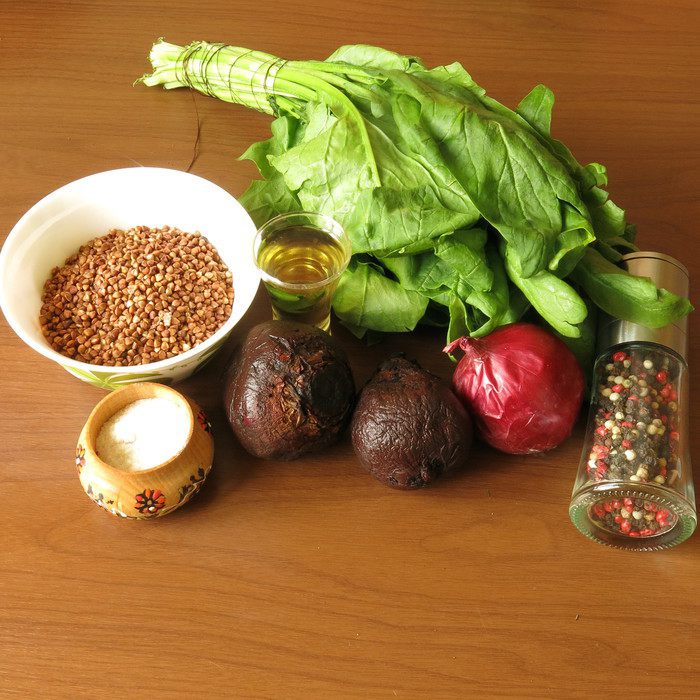 Соединяем часть гречки, половину лука и свеклу, солим, перчим по вкусу.