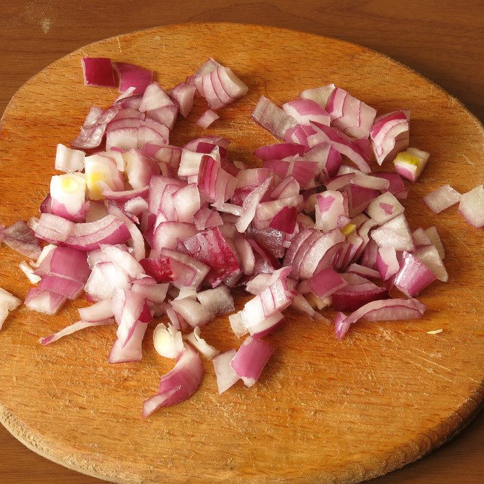 Нарезаем лук. Промываем и варим поджаренную гречку. На 1 стакан крупы 1,5 стакана воды — после закипания солим, варим 15 минут на слабом огне, укутываем казан в полотенце и даем каше дойти.
