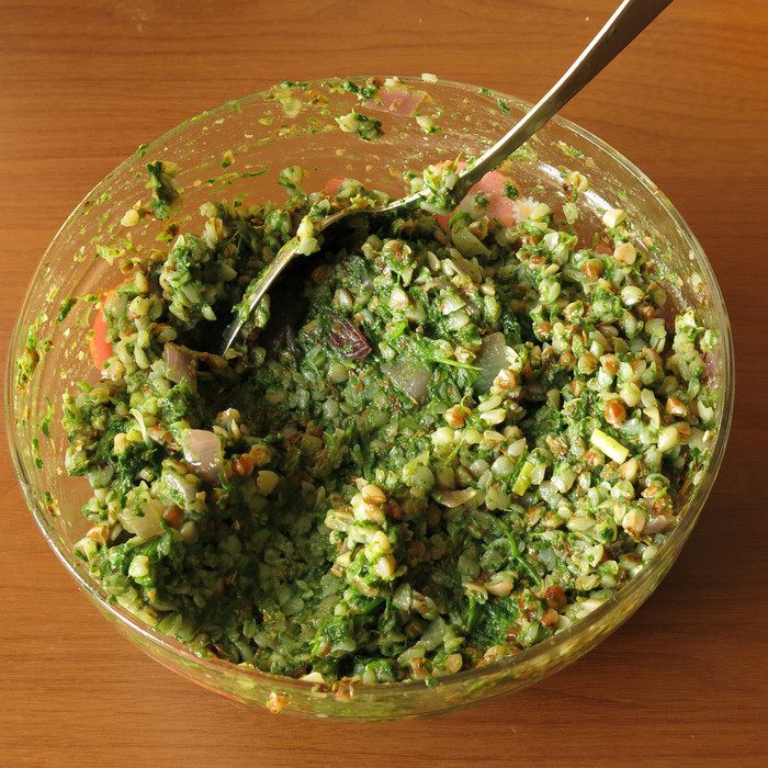 Смешиваем оставшуюся гречку, шпинат, лук, солим, перчим по вкусу.