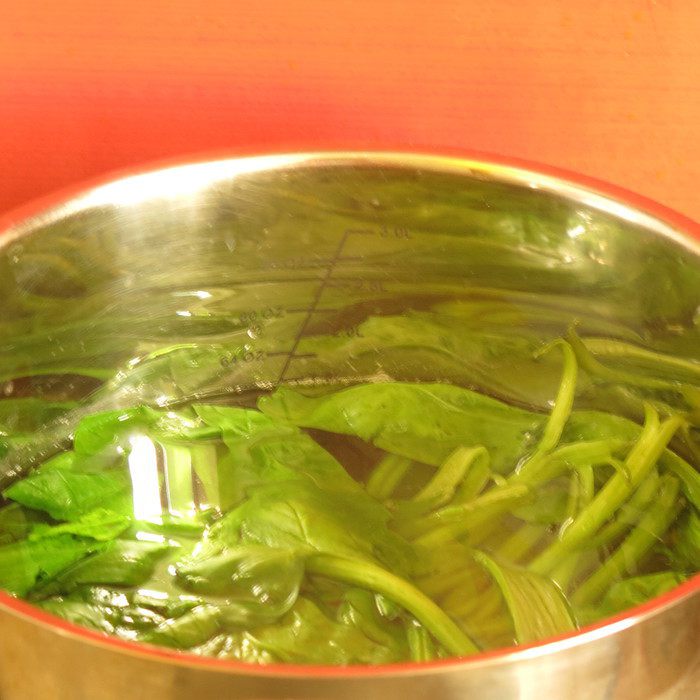 Отвариваем в кипящей воде шпинат 5 минут, охлаждаем его в холодной воде.