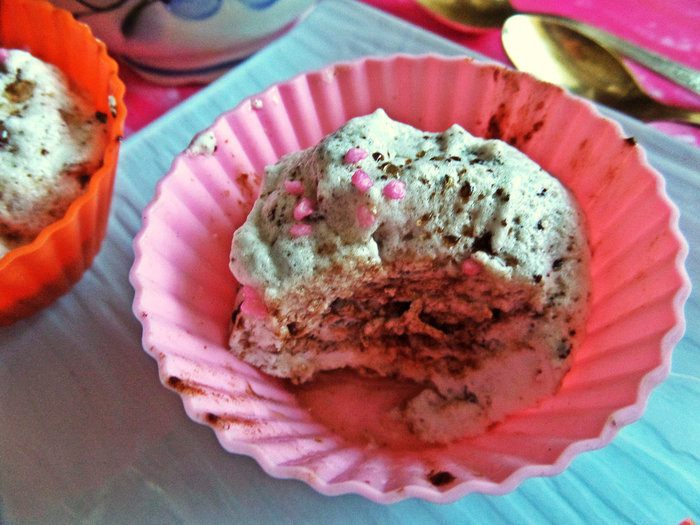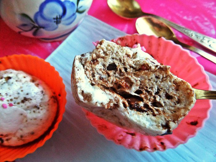 Можно воспользоваться формочкой для СВЧ, но и формочки для маффинов силиконовые тоже подойдут...Показываю оба варианта. Слегка смазать кисточкой с маслом внутри и разложить пушистую массу.