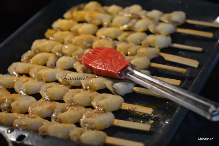 Смазать шампура с креветками маринадом с 2 сторон. Поставить в холодильник на 10 минут.