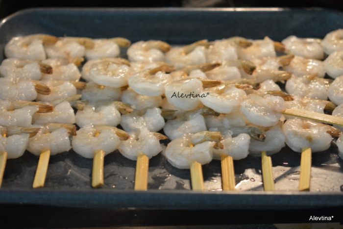 Креветки замороженные можно не очищать хвостики. Нанизывать на шампура на небольшом расстояние друг от друга.