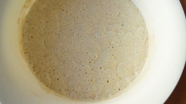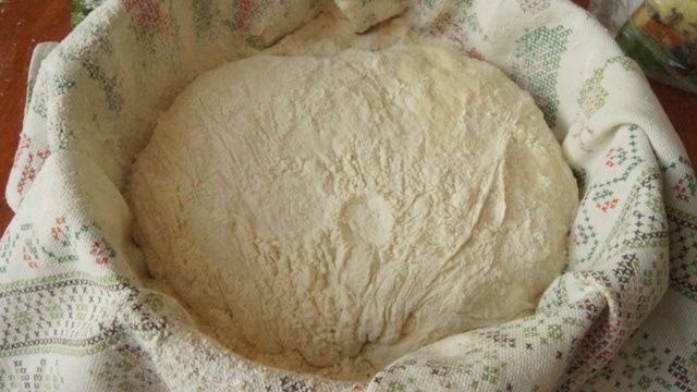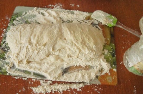 Доску опять присыпать мукой, переложить тесто, разделить его на 4 части. Я делала это силиконовой лопаткой.