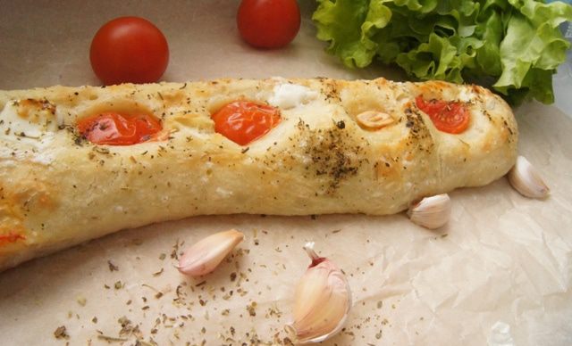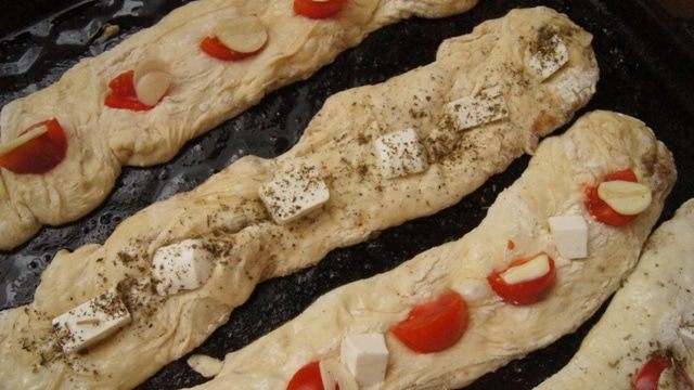Смазать каждую стекку кисточкой оливковым маслом (у меня растительное). Если не используете фету, то присыпьте морской солью. По вкусу присыпьте прованскими травками.