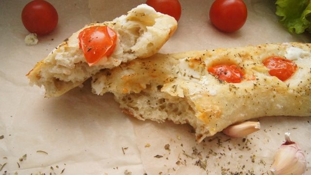 Начинка для такого может быть любой. Я порезала помидорки черри на четвертинки, чеснок слайсами, фету кубиками. Распределить начинку поровну между хлебом.