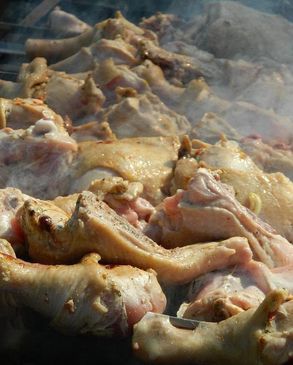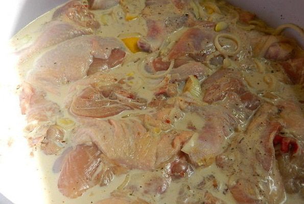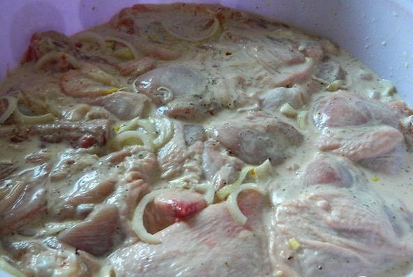 Добавить майонез и пива,еще раз хорошо все перемешать руками, чтобы курица впитала маринад. Лук (большие головки) порезать кольцами,лимон ломтиками и добавить к мясу,в конце добавить приправу для шашлыка и черный молотый перец. Все тщательно перемешать, как бы втирая маринад в курицу.