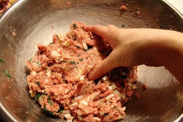 Фарш посолить и поперчить, смешать с оставшимся сырым яйцом, панировочными сухарями, манкой, измельченной петрушкой, сырым луком, жареным луком и хорошо размешать.