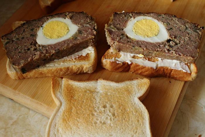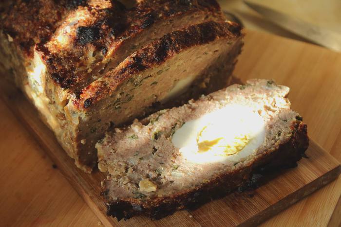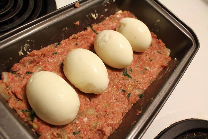 Форму для хлеба смазать маслом, выложить половину фарша, уложить вареные почищенные яйца, накрыть оставшимся фаршем и отправить выпекаться в разогретую до 180°C духовку. На 50-60 минут.