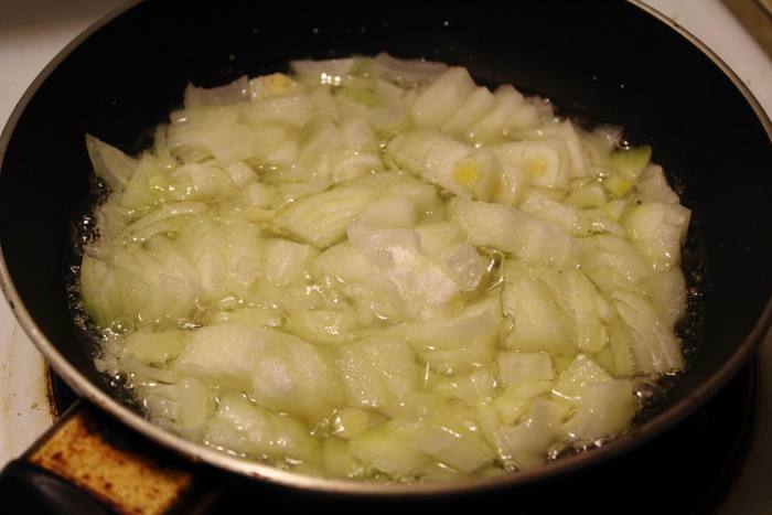 Лук мелко нарезать, половину его обжарить с сахаром, половину оставить сырым.