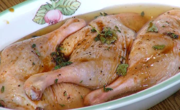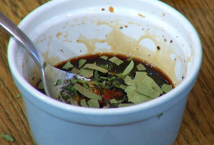 Приготовить соус: мед соединить с соевым соусом, добавить листья тимьяна, можжевельник, измельченный руками лавровый лист, поперчить и перемешать.