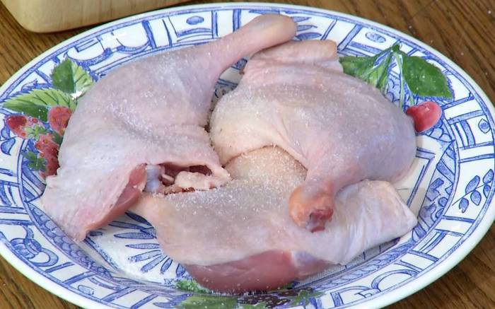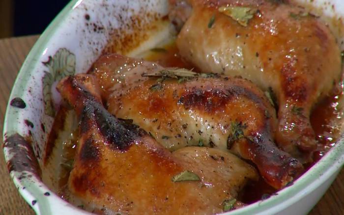 Французы называют такое блюдо Duck Confit — это ножки, которые долго томятся, а потом их еще ставят под гриль, чтобы получилась золотистая корочка. Вместо куриного бульона можно добавить белого или красного вина, сухие травки сюда тоже подойдут идеально!