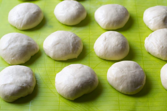 В отдельной емкости смешать кефир, соль, яйца, оставшийся сахар, растопленное сливочное масло, всыпать просеянную муку, добавить разведенные дрожжи.