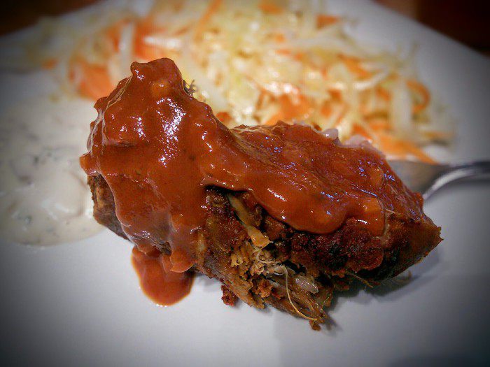 Теперь мясо нужно разобрать на кусочки, переложить на тарелку, полить 5 — 6 ложками соуса, перемешать.
