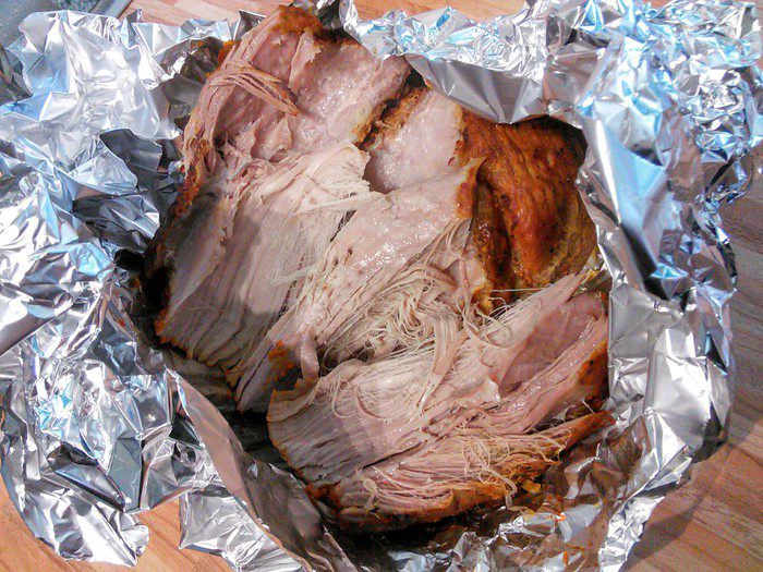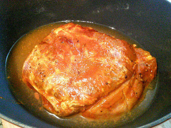 Затем открыть крышку и продолжить запекание еще 30-60 мин. По прошествии 30 мин можно с помощью двух вилок отщипнуть кусочек мяса и если это делается легко, то свинина готова. В противном случае запекать еще пол часа.