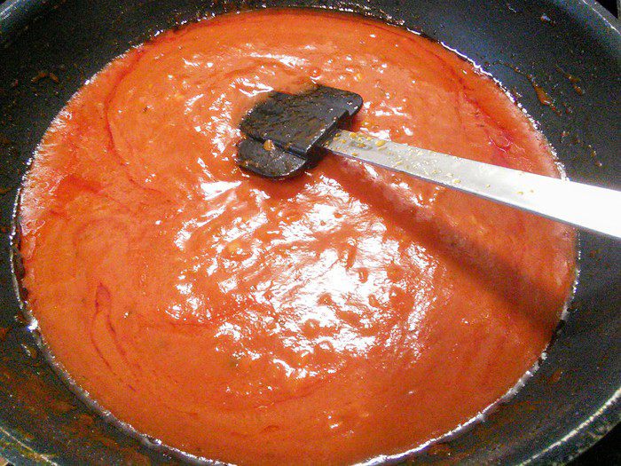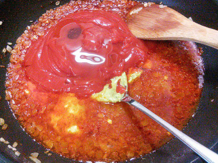 Вливаем апельсиновый сок и добавляем остальные ингредиенты, кроме табаско. Тушим на маленьком огне 5-10 мин. Регулируем остроту соусом табаско и снимаем с огня.
