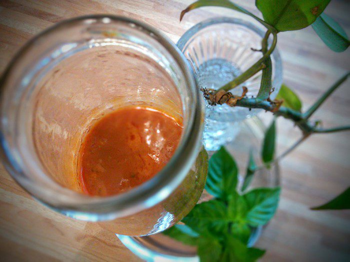 Чистую стеклянную банку или бутылку обдать кипятком, так же и крышечку. Влить горячий соус (я использовала лейку) и закрыть крышкой.