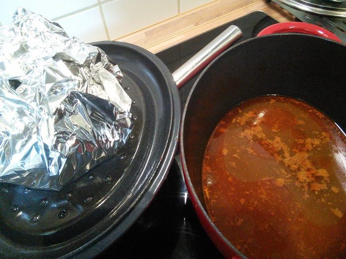Затем обернуть мясо в фольгу и дать ему отдохнуть 30-60 мин. Соус сохранить.