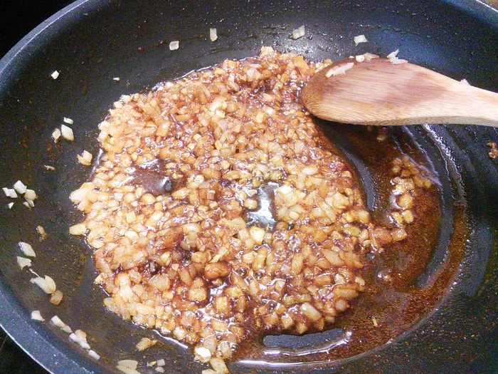 Для соуса барбекю мелко порубить не крупную луковицу и дольку чеснока. На разогретом масле пассеруем до прозрачности. Добавляем копченую паприку и обжариваем в течении одной минуты.