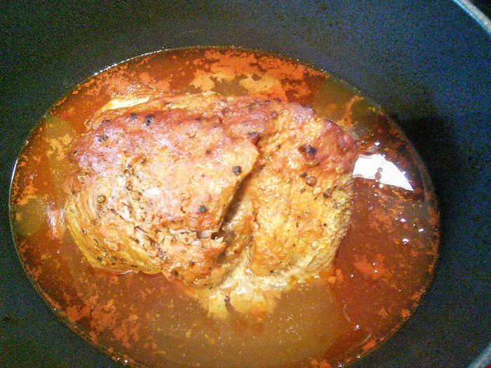 На следующий день вынуть мясо из холодильника и пакета и поместить в глубокую форму для запекания, которую можно закрыть крышкой или фольгой. Духовку разогреть до 120°С. Влить в форму яблочный сок, смешанный с уксусом и запекать в течении 3,5 часов.