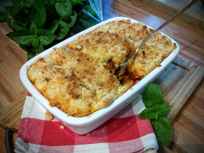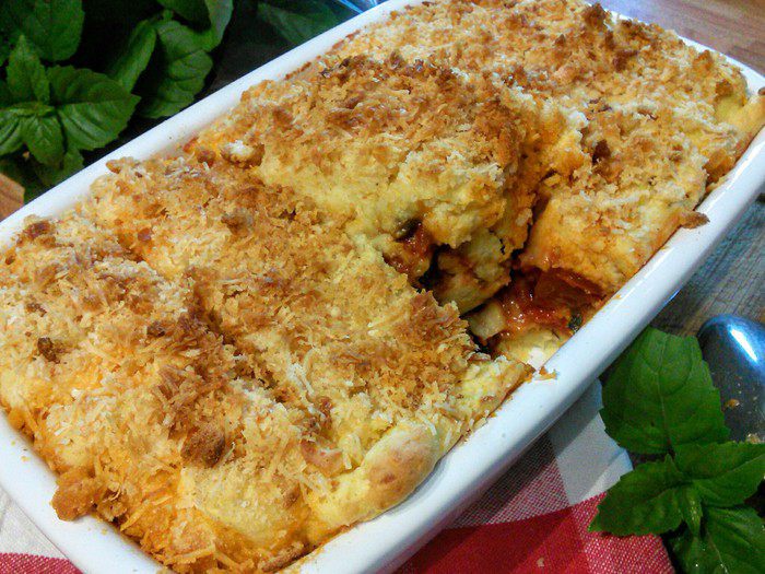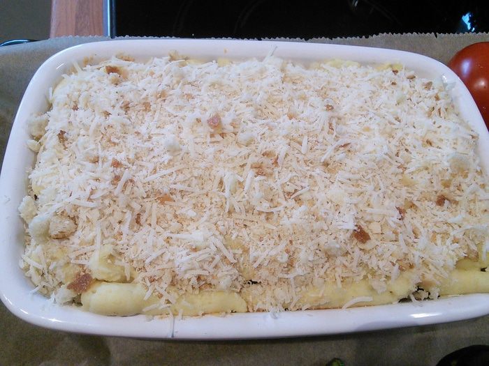 Покрыть оставшимся пюре. Смешать пармезан с сухарной крошкой и посыпать запеканку. Сверху выложить сливочное масло (у меня оливковое). Выпекать в заранее разогретой до 200 ° духовке 30 мин.