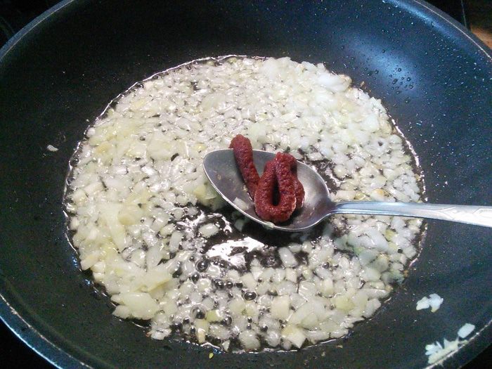 В горячем масле пассеруем лук и чеснок, добавляем томатную пасту, обжариваем в течении одной минуты.