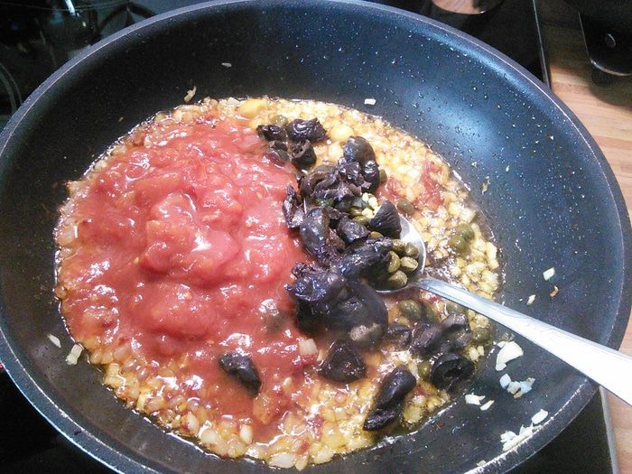 Добавляем порезанные маслины, каперсы и помидоры, размятые вилкой. Доливаем воды, солим, перчим, регулируем кисло-сладкий баланс щепоткой сахара, тушим 10 мин,
