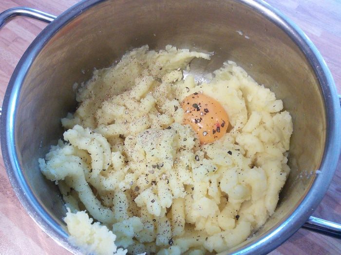 Вареную картошку еще теплой размять в пюре, посолить и поперчить, приправить мускатным орехом. Я добавила желток.