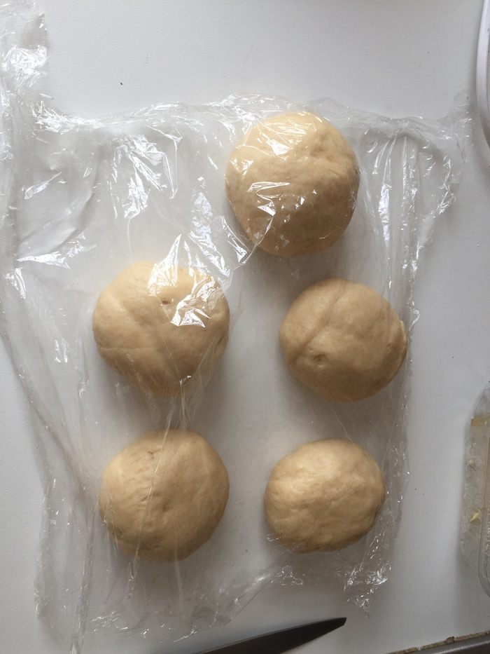 Вымесим его и разделим на 5 частей (у меня по 85 г каждая). Каждую скатаем в шар. Накроем и пусть отдохнут минут 7.
