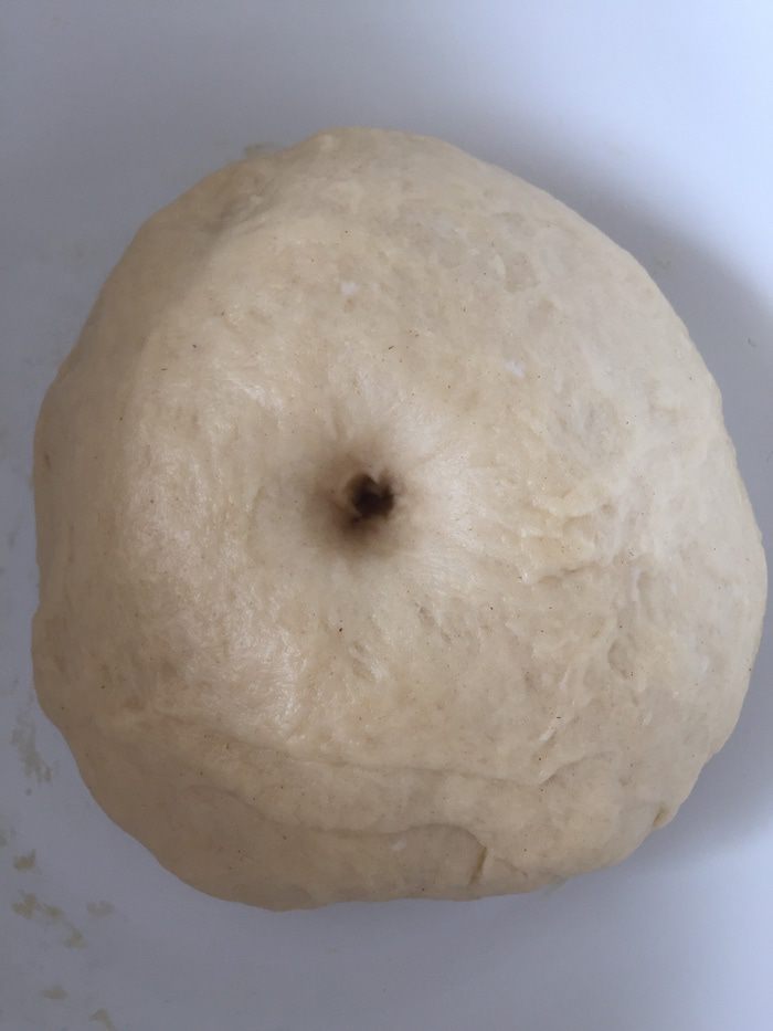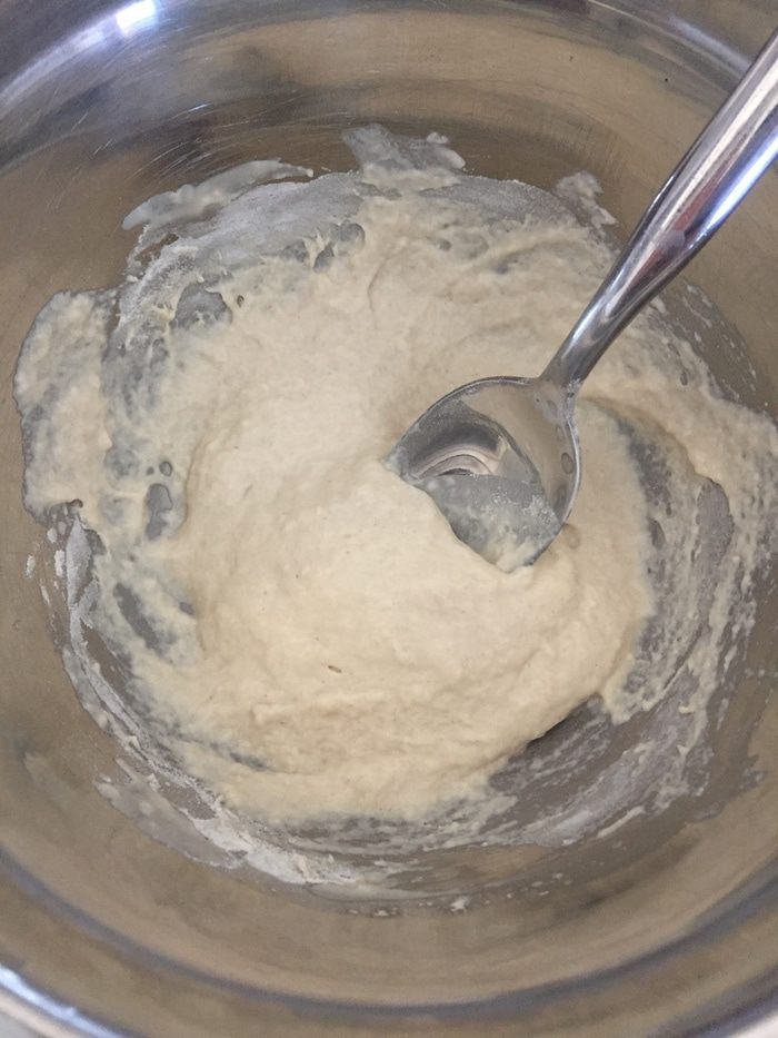 Вот такое подошедшее тесто (ориентир — дырочка от пальца не затягивается). Оно стало заметно мягче.
