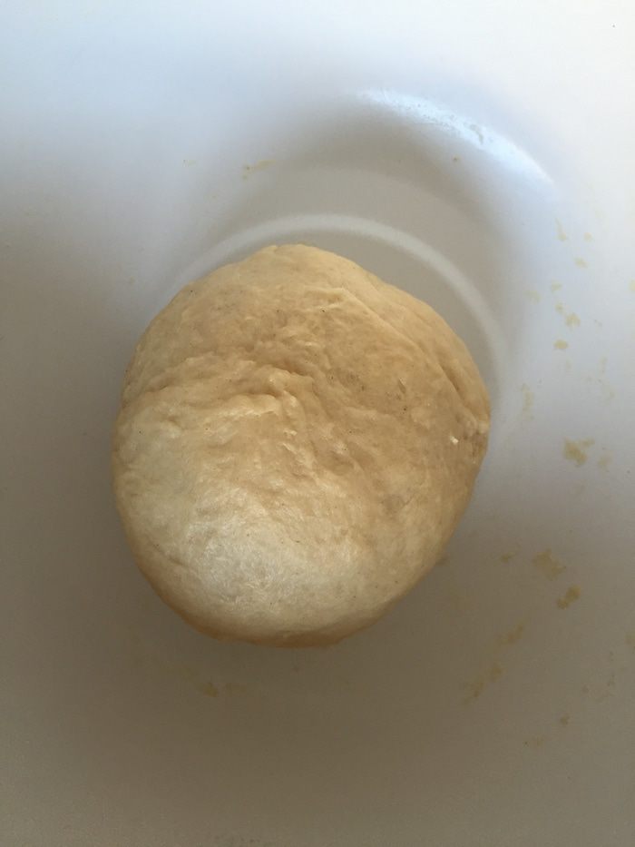 Отдохнувшее тесто намного легче месить. Чем мы и займемся в течении 10 минут. Пока оно не станет абсолютно гладким и ровным. Оно достаточно плотное — чуть мягче пельменного. Собираем в шар, накрываем и в теплое место до удвоения в объеме.