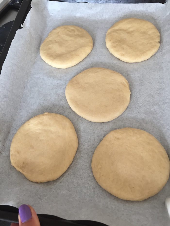 Теперь каждый шарик раскатаем в лепешку толщиной 1 см. Заготовки размешаем на противне, застеленном бумагой. Оставляем на расстойку на полчаса