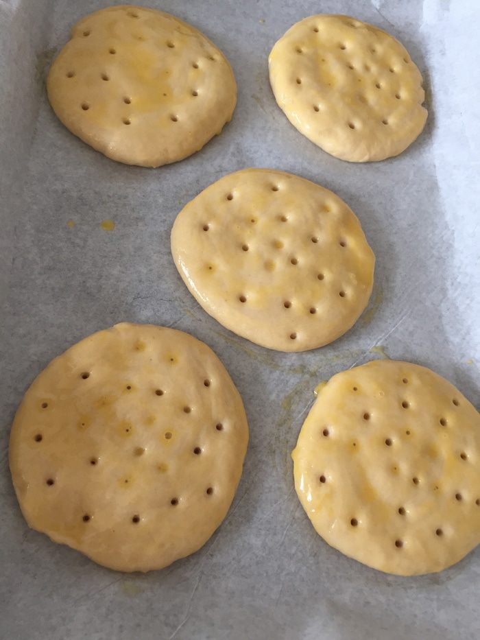 Разогреваем духовку до 180°C. Делаем на каждой лепешке проколы. Смазываем желтком или яйцом.