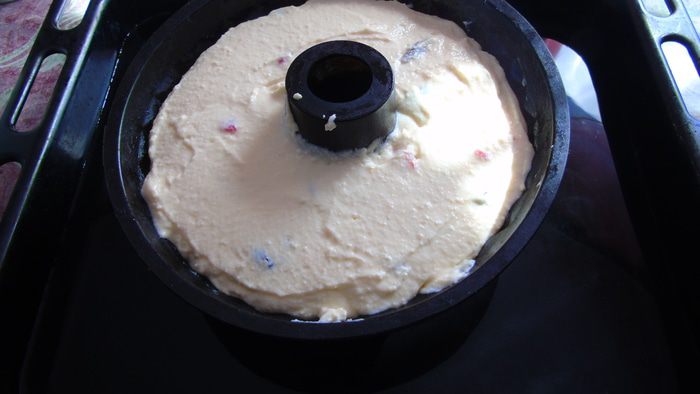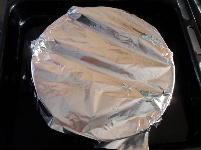 Поставить форму в глубокий противень, накрыть фольгой, а в противень налить воды (где-то около 1 л). Отправить в разогретую до 160°С духовку ,по прошествии 20 минут снять фольгу и допекать до готовности еще 30-40 минут, но может и больше, зависит от духовки.