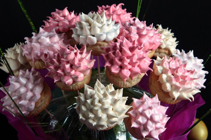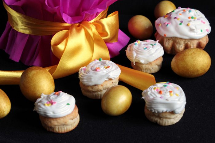 Слегка взбить белки с сахарным песком и лимонным соком (0,5 ч.л.). Поставить на кипящую водяную баню, продолжая взбивать миксером 10 минут. Масса должна получиться очень пышной. Снять кастрюльку с бани, продолжая взбивать еще минут 7-10. Остудить и украшать куличики, добавив по желанию пищевой краситель, который тоже развести парой-тройкой капель лимонного сока (если порошковый). У меня были красители двух цветов: крем-брюле и красный, слабо концентрированный.