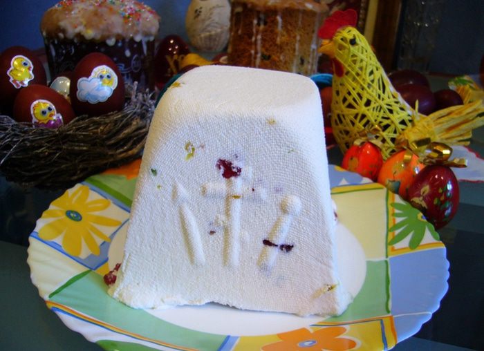 Собрать форму для пасхи. Выложить ее влажной марлей. Творожную массу переложить в форму, закрыть дно марлей, положить блюдечко, на него – гнет.