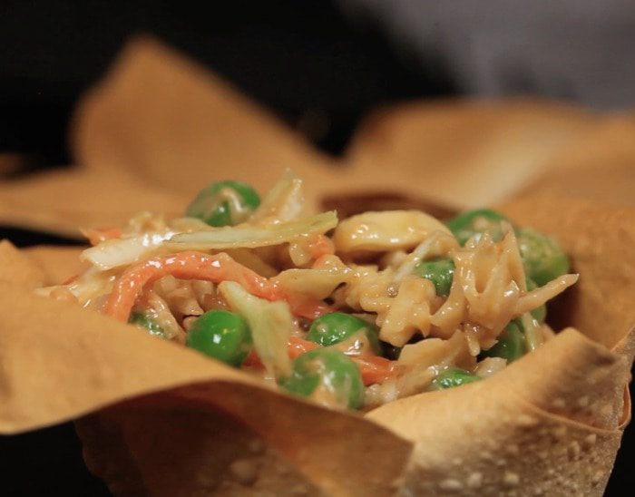 Подавать можно как в общем салатнике, так и в тарталетках. Я сделала корзиночки из теста фило.