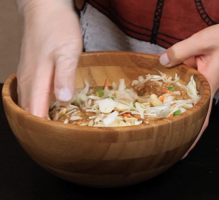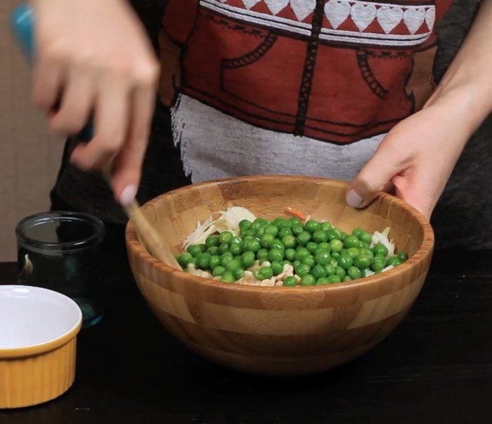 Смешать нашинкованную капусту, морковь, свежий горошек и арахис.