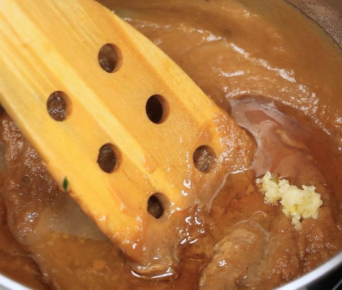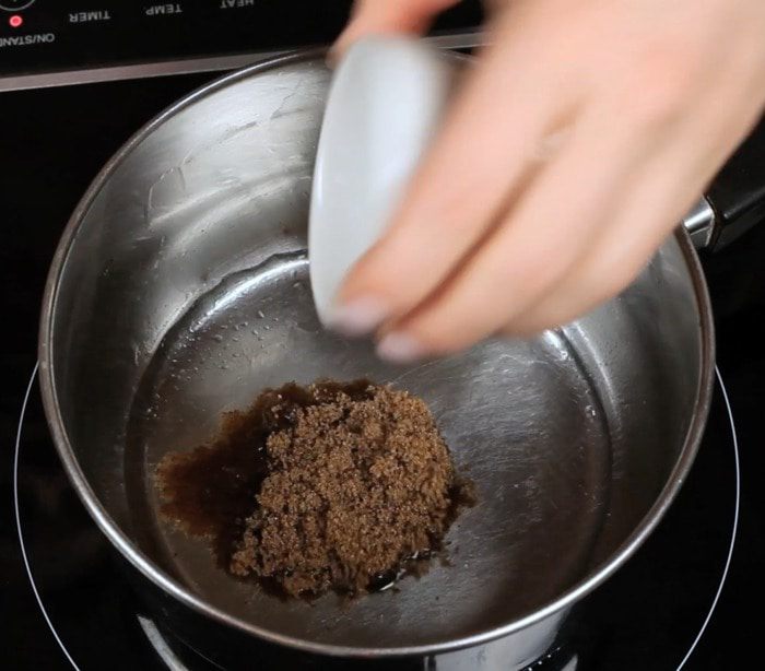В сотейнике соединить арахисовую пасту, воду и коричневый сахар, прогреть до однородности (чтобы сахар растворился).