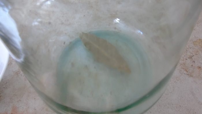 Трехлитровую банку хорошо со всех сторон просматриваем, чтобы исключить трещинки. На дно кладем лавровый лист.