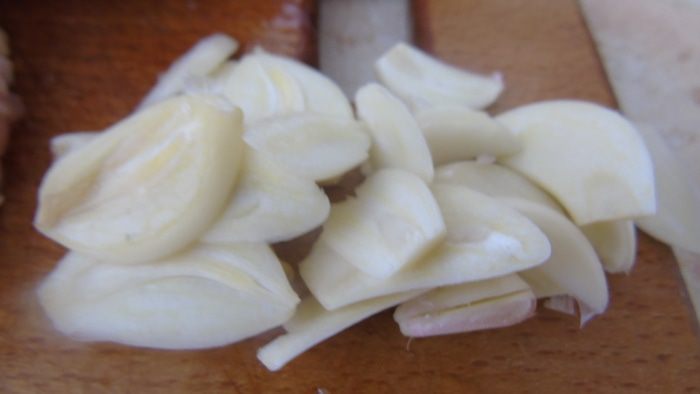 Чеснок очищаем и нарезаем пластинами.