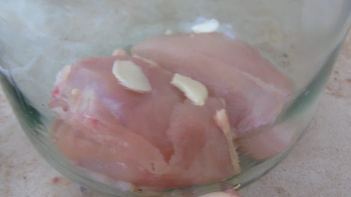 На дно кладем куриное филе, его солить не надо, оно будет готовится в соленом соке, что пустит мясо и этого будет достаточно. Сверху кладем пару пластинок чеснока.