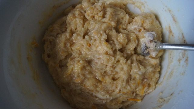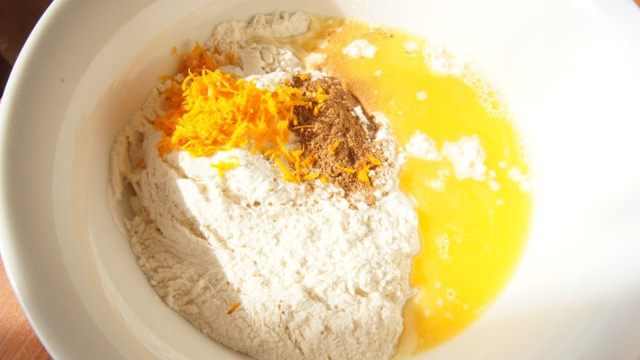 Из апельсина выжать сок и натереть цедру. Муку, разрыхлитель, соль и корицу смешать. Соединить обе смеси.