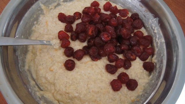 Смешать тесто с набухшими хлопьями, хорошо перемешать и добавить вяленую вишню. *У автора была клюква и черника.